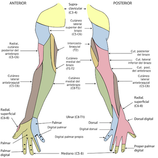 Ramos supraclaviculares : • Nervio dorsal de la escapula • Nervio torácico largo • Nervio supraescapular • Nervio subclavio. Ramos infraclaviculares : • Nervio pectoral lateral y medial • Nervio subescapular superior e inferior • Nervio toracodorsal • Nervio cutáneo medial del brazo • Nervio cutáneo media del antebrazo • Nervio musculocutáneo • Nervio axilar • Nervio radial • Nervio mediano • Nervio cubital
